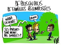 La famille reconstituée ou recomposée: parents divorcés, remariés, vivant avec les enfants d'un ou de deux mariages précédents et les enfants de leur union actuelle.